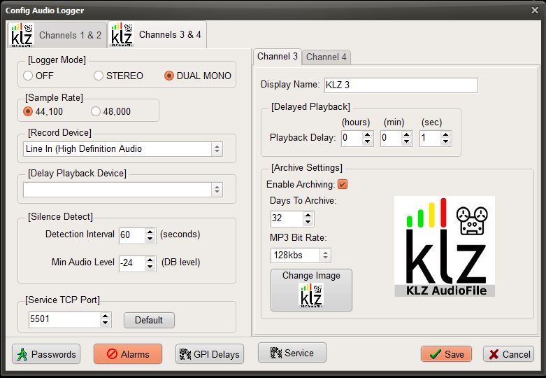 Select an image of your stations call letters for each channel being logged. The image format can be Png, Bmp, or Jpg. The image will be downloaded by the new KLZ AudioFile player, and will be displayed when playing, or monitoring the channel. The ID image will also be embedded in your extracted mp3 files.